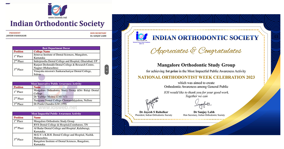 From October 5th to 11th, 2024, the Indian Orthodontic Society, in collaboration with the Mangalore Orthodontic Study Group (MOSG), organized "Orthodontic Awareness Week". A series of engaging programs were scheduled to educate and inform the community. Through these initiatives, we aimed to make a meaningful impact and enhance the lives of those we served. Thank you for joining us in our mission to promote healthier smiles and better oral health!