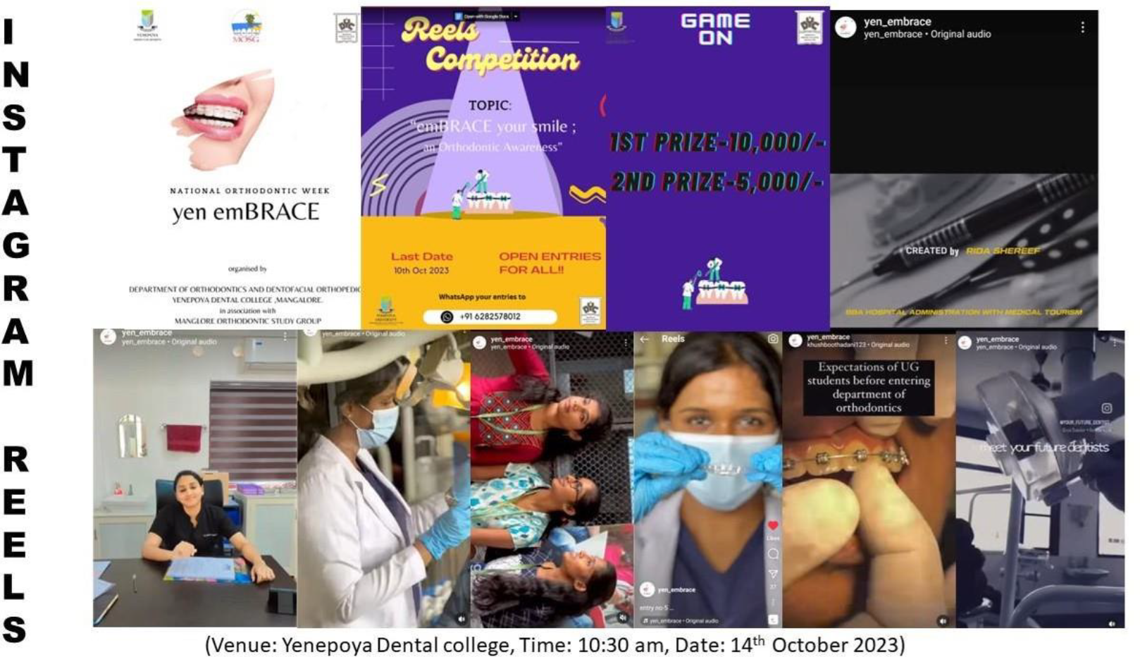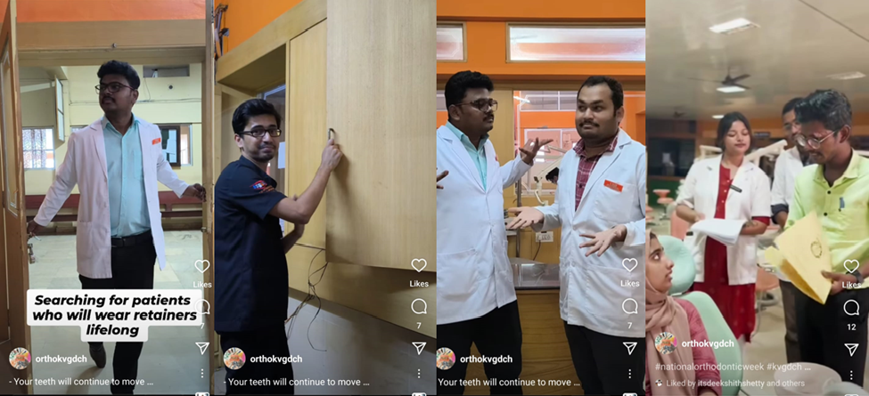 An Instagram Reel competition was organized at KVG Dental College on 3rd October 2024, at 11:00 AM, to raise awareness about orthodontic treatment. Participants actively created short, engaging reels highlighting the importance of orthodontic care, and the overall health benefits of proper treatment done by qualified IOS endorsed orthodontists. The competition effectively utilized social media to reach a younger audience, making orthodontic concepts more relatable and accessible. Through creative content and messaging, participants helped demystify orthodontics and promoted early treatment. This event significantly boosted public interest and awareness, contributing to a broader understanding of orthodontic care's importance in improving dental health.
