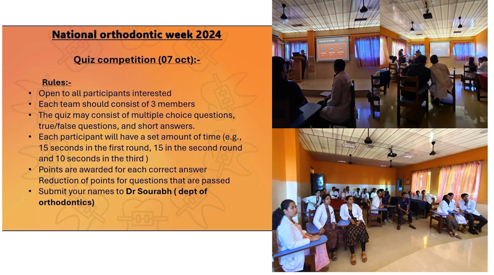 The Quiz Competition was held at KVG Dental College on 7th October 2024, at 11:00 AM. Participants tested their understanding of orthodontics through a variety of stimulating questions, promoting friendly competition and collaboration. The event aimed to enhance students' awareness of dental health and orthodontic practices, creating an engaging and fun atmosphere for all attendees.