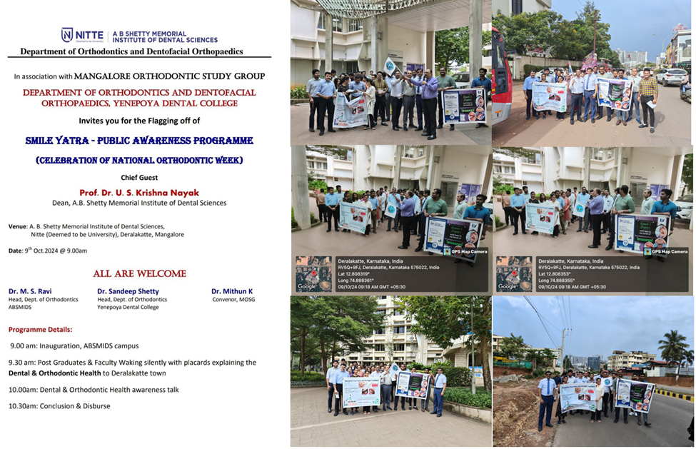 The "Smile Yatra : A Public Awareness Program" took place on 9th October 2024, at Deralakatte, starting at 9:00 AM. This impactful event featured a silent march where participants carried posters and placards emphasizing the importance of orthodontic treatment and raising awareness about dental health.