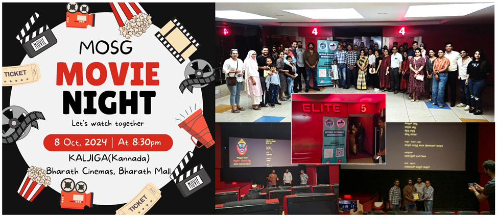 The MOSG Movie Night took place on 8th October 2024, at Bharath Cinemas in Bharath Mall. The event aimed to support local filmmakers and promote the "Go Vocal for Local" initiative. Attendees gathered at 8:30 PM for an enjoyable evening featuring the Kannada film "Kaljiga."