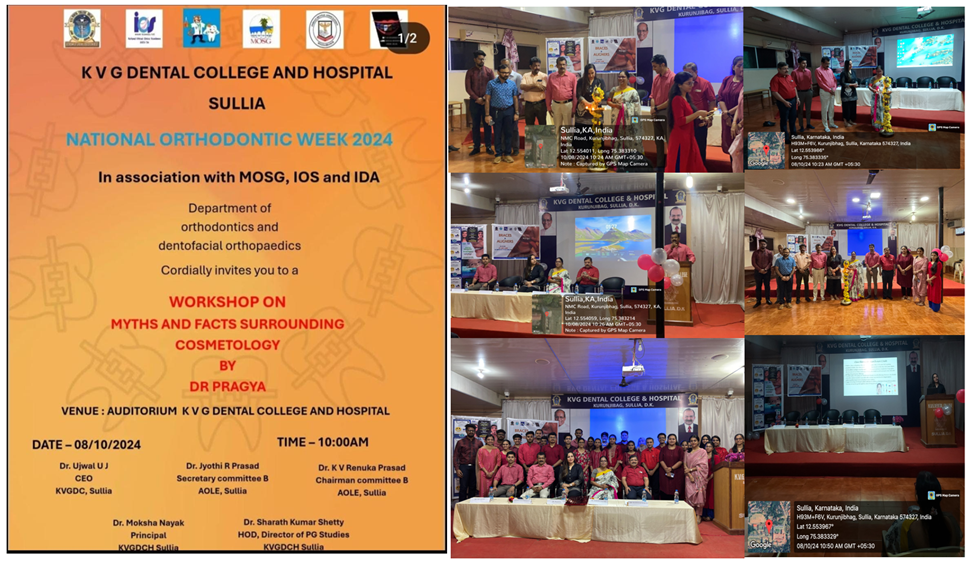 The Workshop on Myths and Facts Surrounding Cosmetology was conducted at KVG Dental College on 8th October 2024. This informative session aimed to debunk common misconceptions about cosmetic procedures while providing accurate information. Participants engaged in discussions and demonstrations, enhancing their understanding of various cosmetic treatments and their implications. Additionally, the workshop included a segment on orthodontic treatment awareness, highlighting its benefits and encouraging informed decision-making. This dual focus successfully promoted both cosmetology and orthodontic awareness among attendees, fostering a holistic understanding of dental and cosmetic care.